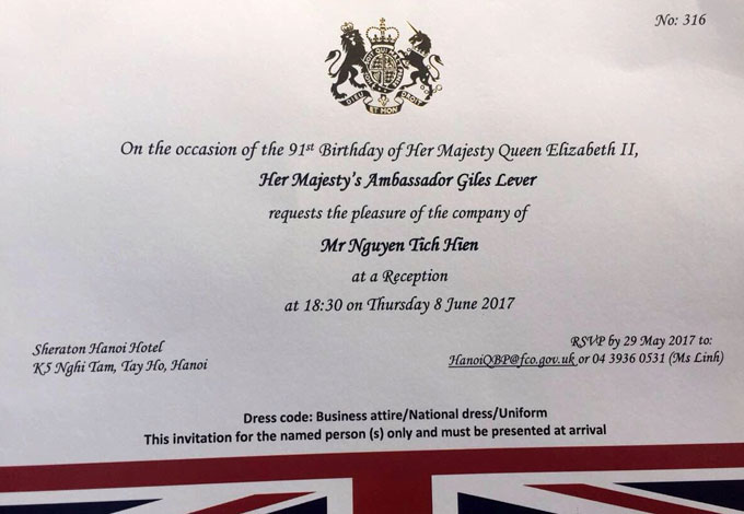 Tuần qua, Tổng Lãnh sự Anh tại TP Hồ Chí Minh và Đại sứ quán Anh tại Hà Nội đã lần lượt tổ chức tiệc mừng sinh nhật lần thứ 91 của Nữ hoàng Anh Elizabeth II. Năm 2017 cũng là năm đánh dấu Lễ kỉ niệm Sapphire - 65 năm trị vì của Nữ hoàng.